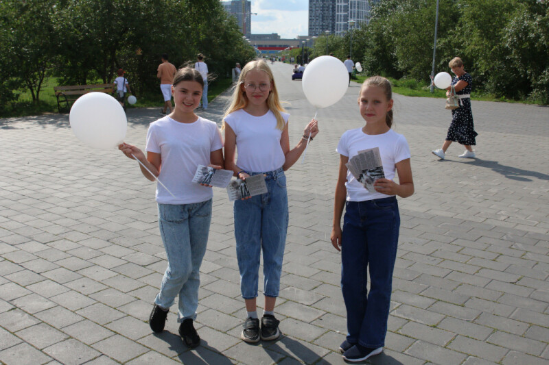 Участники акции в Екатеринбурге в память о погибших детях раздали информационные листовки и белые шары всем желающим, находящимся в парке. Особый интерес, в первую очередь у детей, находящихся в парке, вызвала возможность нарисовать на плитке белой краской по трафарету белого голубя – один из символов трагедии и потерянных детских жизней.