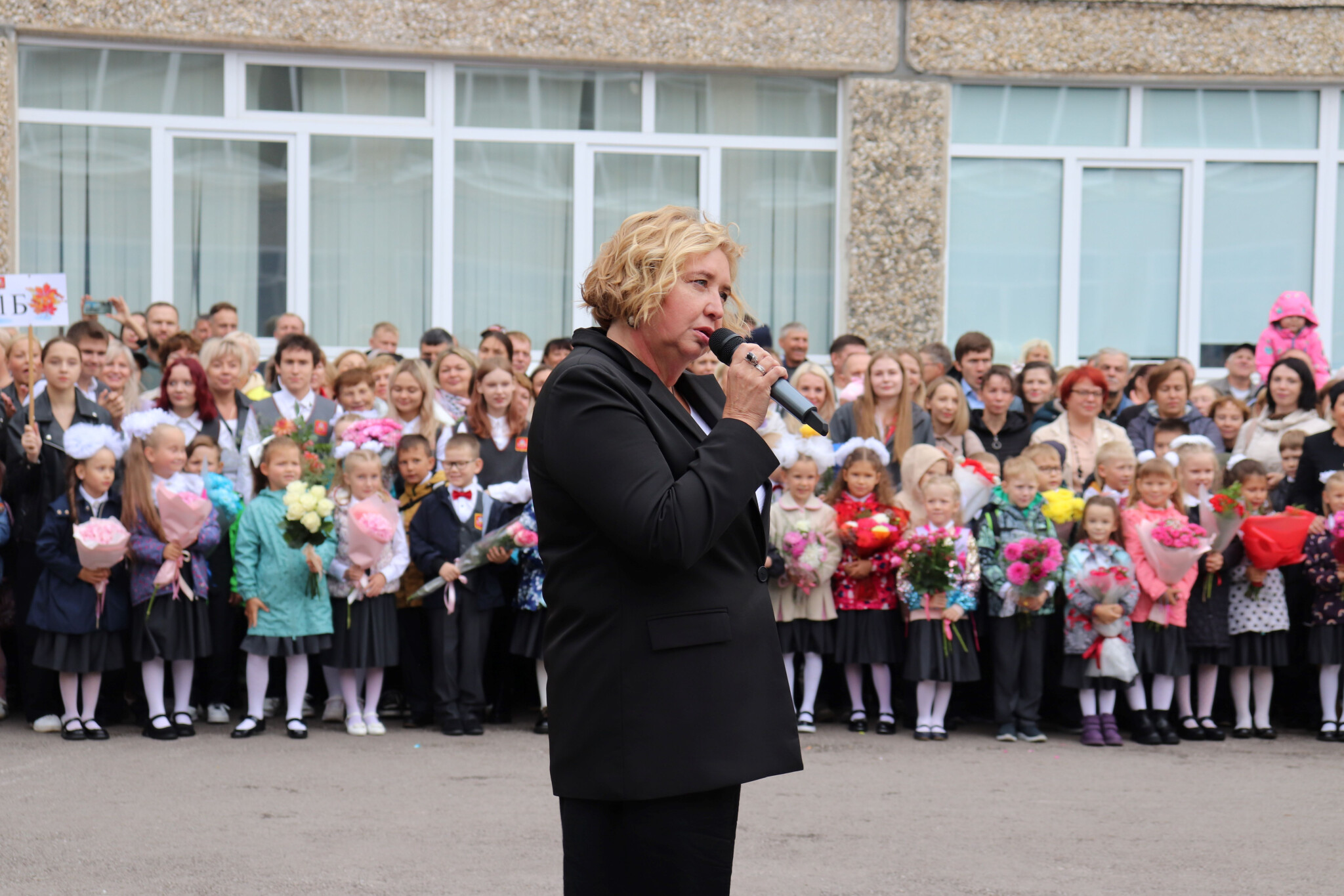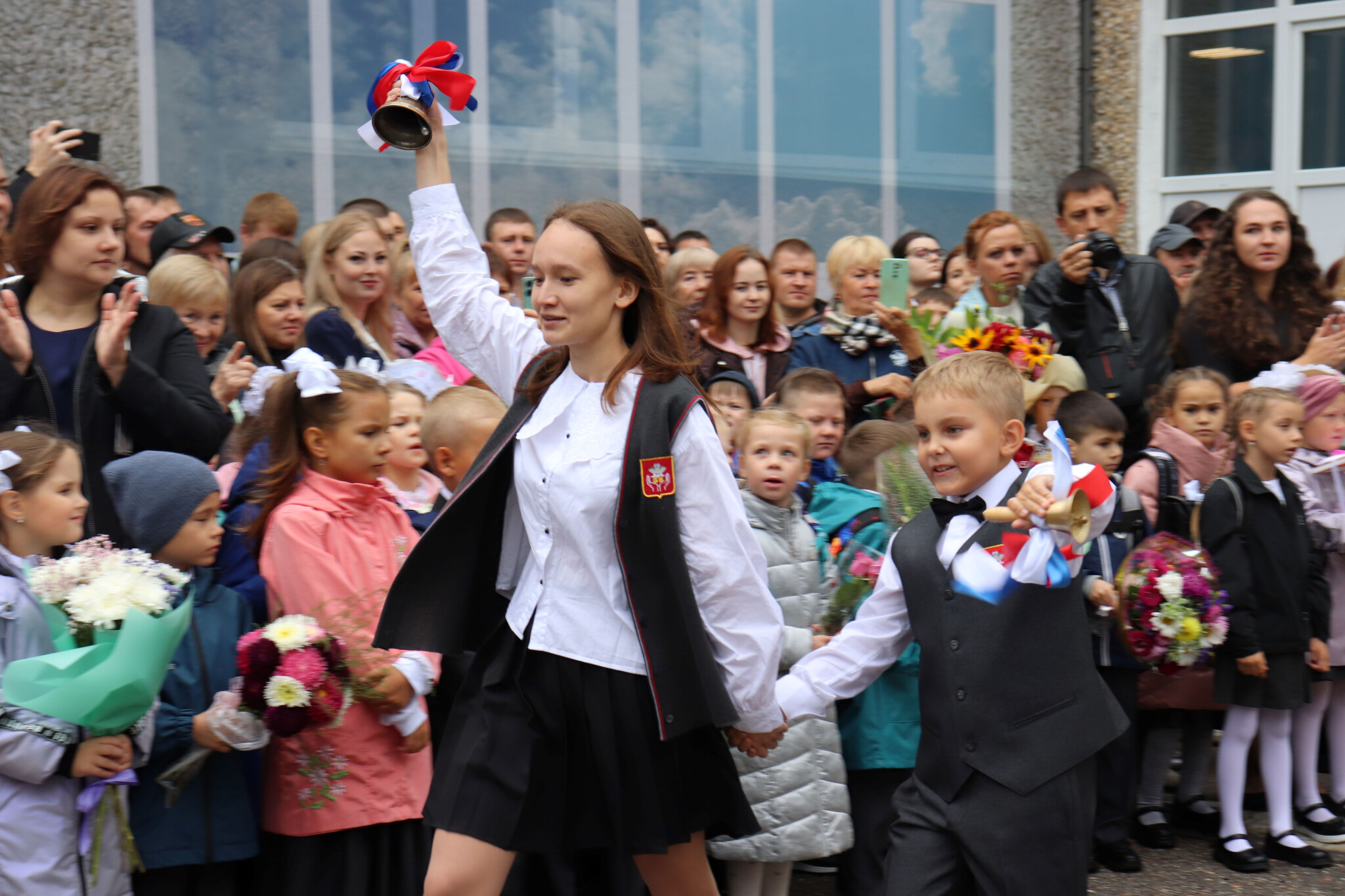 Первоклассников и их родителей Уполномоченный поздравила в МАОУ "СОШ №55 им. дважды Героя Советского Союза Г.Ф. Сивкова" города Перми. Сегодня на линейке было представлено 10 первых классов.