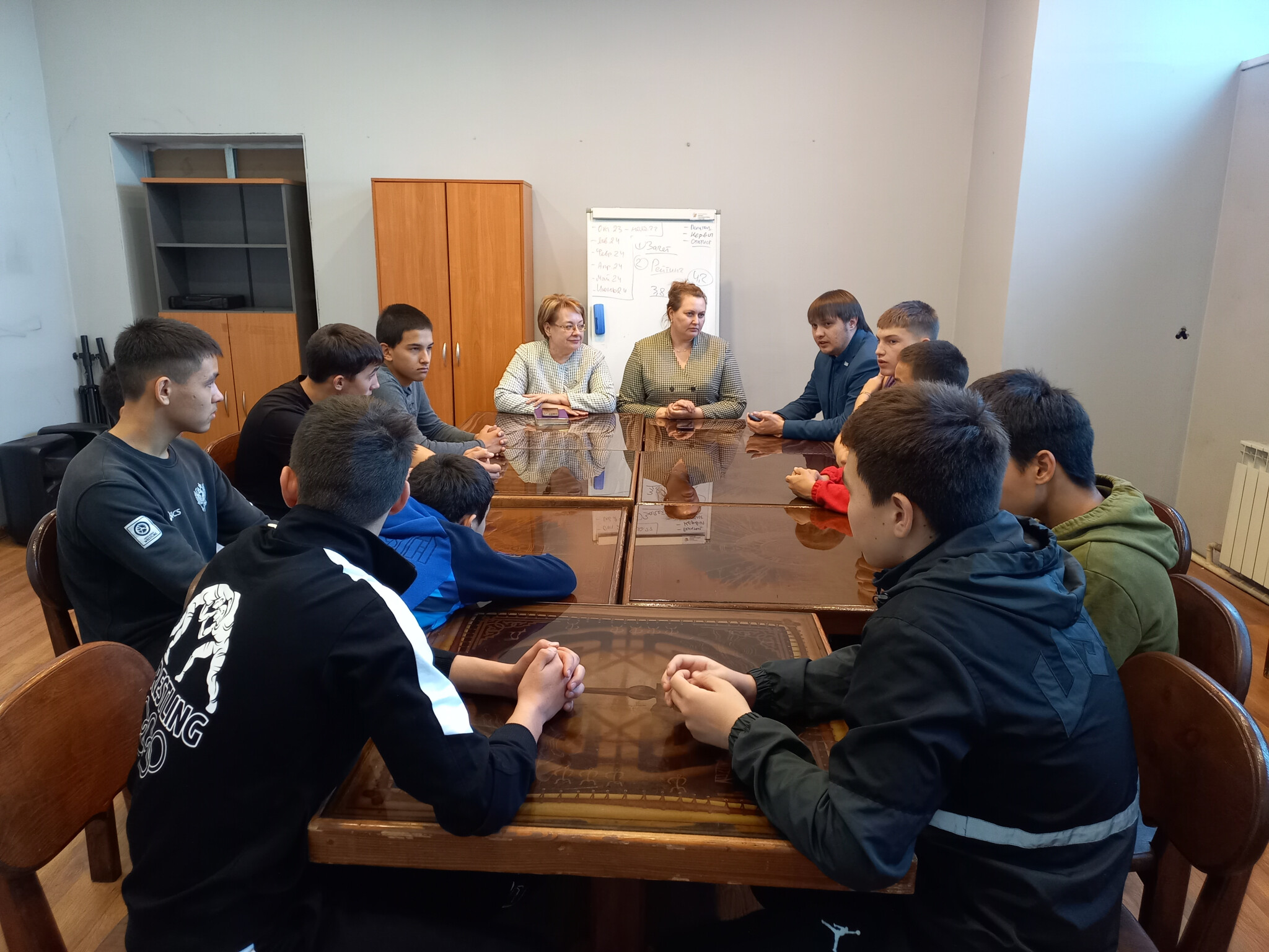 Первыми к юным борцам приехали детский правозащитник Хакасии Ирина Ауль и заместитель Министра труда и социальной защиты республики Хакасия Светлана Лавриненко. Ирина Евгеньевна рассказала спортсменам о деятельности Уполномоченного, поговорили о мечте и как её достичь, пожелала ребятам успехов в учёбе и на борцовском ковре.