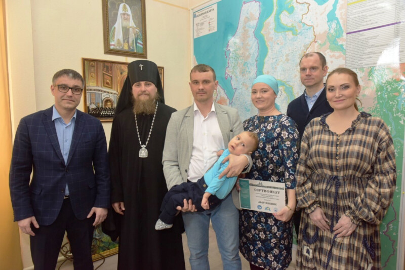 В преддверии Светлого праздника Пасхи Архиепископ Николай и Уполномоченный по правам ребенка в Ямало-Ненецком автономном округе Данило Трубицын вручили сертификат на оплату курса реабилитации родителям маленького Льва Янкина.