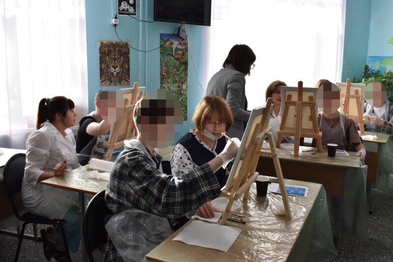 Следует отметить, что во всех мастер-классах с каждым ребенком в паре рисует специалист отделения. Вместе они выбирают сюжет, цвета, помогают друг другу. Теперь они уже не врач и пациент, а соавторы живописного шедевра.