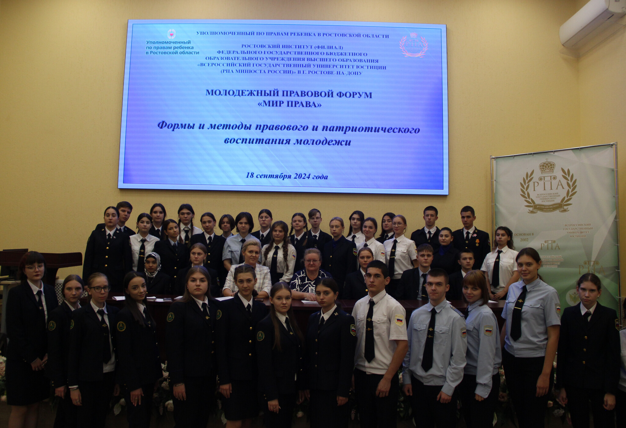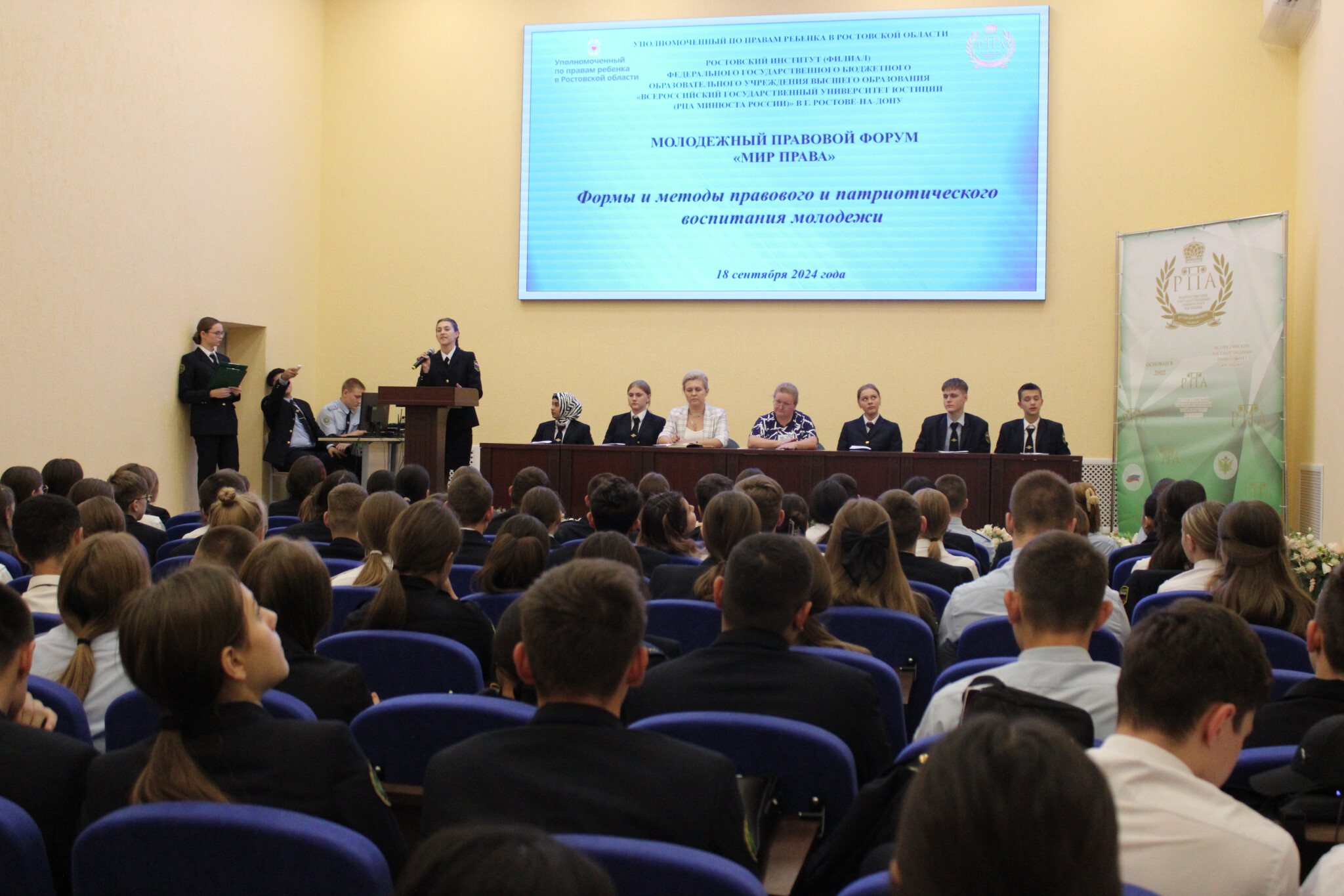 При участии Уполномоченного по правам ребенка в Ростовской области в рамках реализации плана научно-исследовательской деятельности на 2024 год Ростовским институтом (филиалом) ВГУЮ (РПА Минюста России) проведен молодежный правовой форум «Мир права» на тему: «Защита прав и интересов детей, обеспечение их безопасности», в ходе которого обсуждались формы и методы правового и патриотического воспитания молодежи.