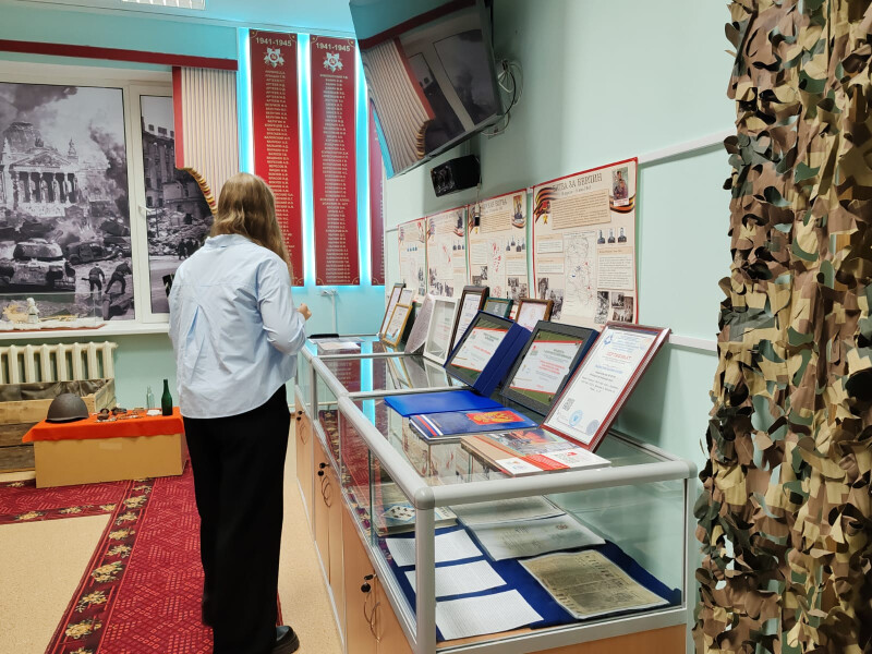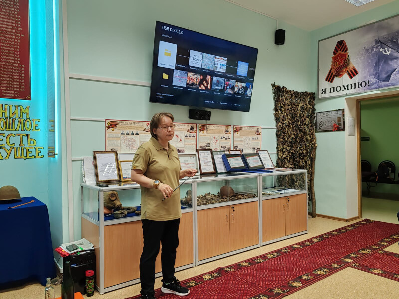 Руководитель военно-патриотического клуба «Поиск» Марина Ледкова провела экскурсию по музею, в котором ребята познакомились с экспонатами, а также побывали в землянке. Землянка реалистично оформлена, создаётся ощущение, будто попадаешь в прошлое.