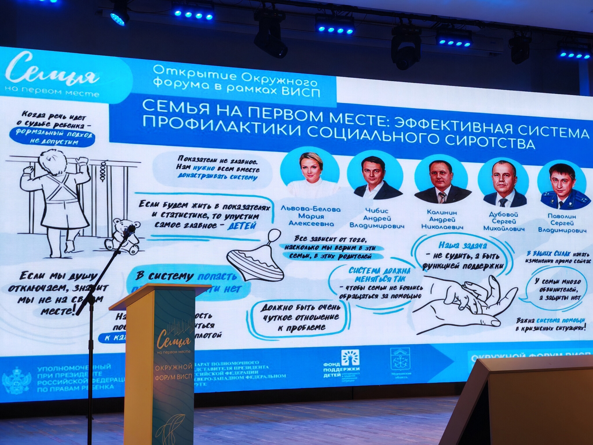 С приветственным словом к участникам Форума обратились Губернатор Мурманской области Андрей Чибис, Уполномоченный при Президенте РФ по правам ребенка Мария Львова-Белова, Главный федеральный инспектор по Мурманской области Андрей Калинин, председатель Мурманской областной Думы Сергей Дубовой и прокурор Мурманской области Сергей Паволин.