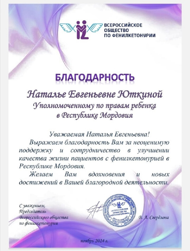 В Республике Мордовия создано и успешно работает Региональное отделение Всероссийского Общества по фенилкетонурии. Фенилкетонурия – орфанное заболевание, требующее пожизненного лечения. В 2024 году 36 несовершеннолетних имели этот диагноз. Приняла посильное участие в решении вопроса по введению в регионе новой меры социальной поддержки детям-инвалидам с фенилкетонурией. Общение с руководителем Мордовского отделения – заботливой Ириной Арискиной, с мамами больных деток оставляет в душе теплоту и придает энергии! Огромное спасибо за добрые слова в мой адрес. Продолжаем взаимодействие. Надеюсь, меры поддержки будут расширены и на взрослых людей, больных фенилкетонурией. Особенно этот вопрос актуален для будущих мам. Ради здоровья малыша им необходимо соблюдать диету и принимать дорогие специализированные продукты.