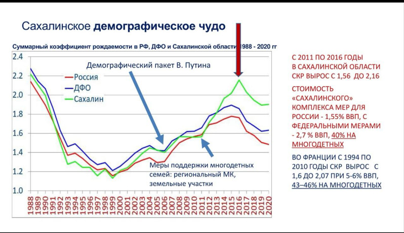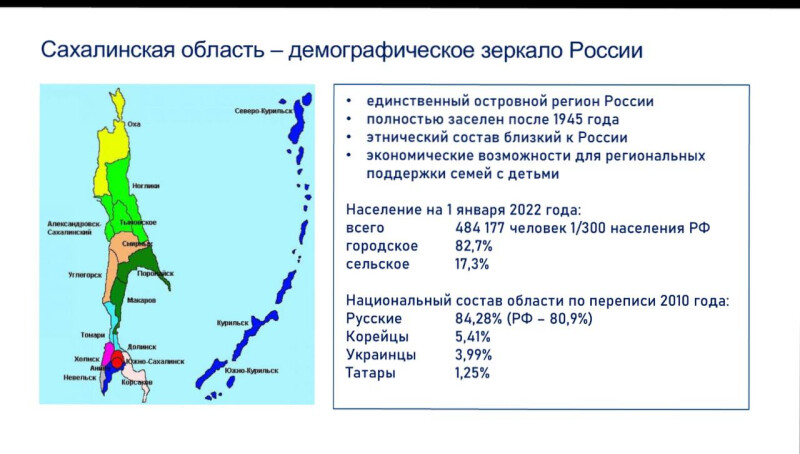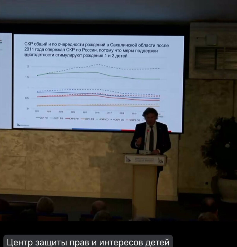 В своем выступлении Сергей Игоревич Рыбальченко, председатель Комиссии Общественной палаты РФ по демографии, отметил "Сахалинское демографическое чудо", назвав область "демографическим зеркалом России".
