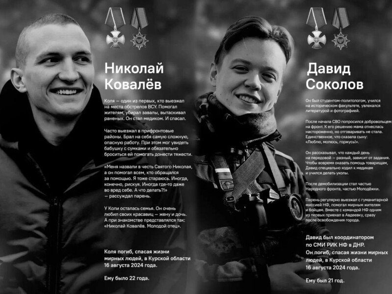 Николай Ковалёв («Чапай») и Давид Соколов («Тюр») — волонтёры Молодёжки Народного Фронта, героически погибшие при эвакуации и оказании гуманитарной помощи мирным жителям Курской области.