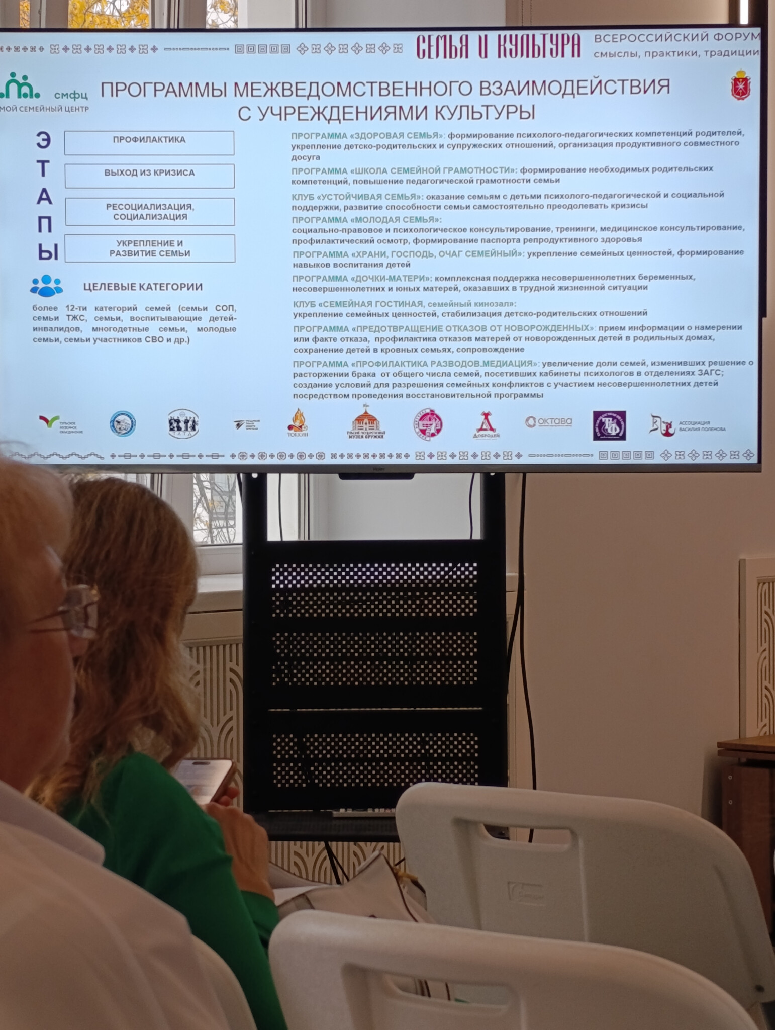 На пленарных заседаниях, панельных дискуссиях и дискуссионных площадках обсуждали тему культуры в поддержке семьи: как музеи, театры, библиотеки и дома культуры могут стать центрами притяжения для всей семьи и помочь в воспитании детей, также открытие на базе этих учреждений подростковых центров, центров дневного пребывания для детей с инвалидностью, клубов «Устойчивая семья», родительских гостиных.