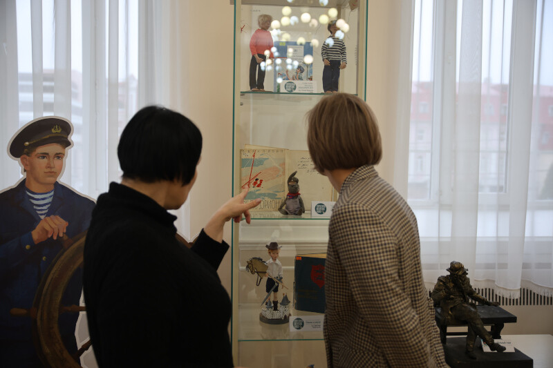 Сотрудники библиотеки провели небольшую экскурсию: рассказали об истории учреждения и показали экспозицию «Миры Владислава Крапивина», которая действует на территории библиотеки.