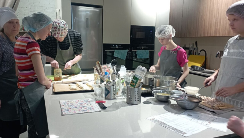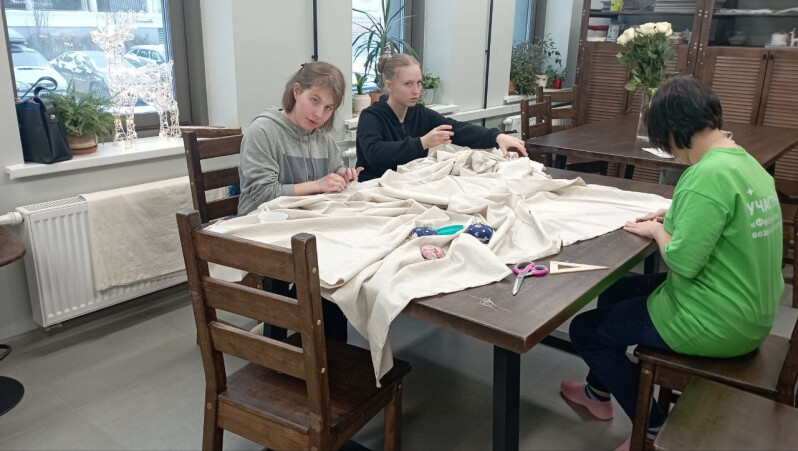 Как всегда, здесь кипит жизнь. Ребята – инвалиды 18+ РАБОТАЮТ! Кто-то учится делать рогалики (важно! – все операции! Начиная с теста и заканчивая выпеканием!). А девочки шьют! И это не просто что-то для себя! Это специальный ЗАКАЗ на скатерти и салфетки!!! А значит, ребята не только приобретут навыки шитья, но и получат заработную плату!