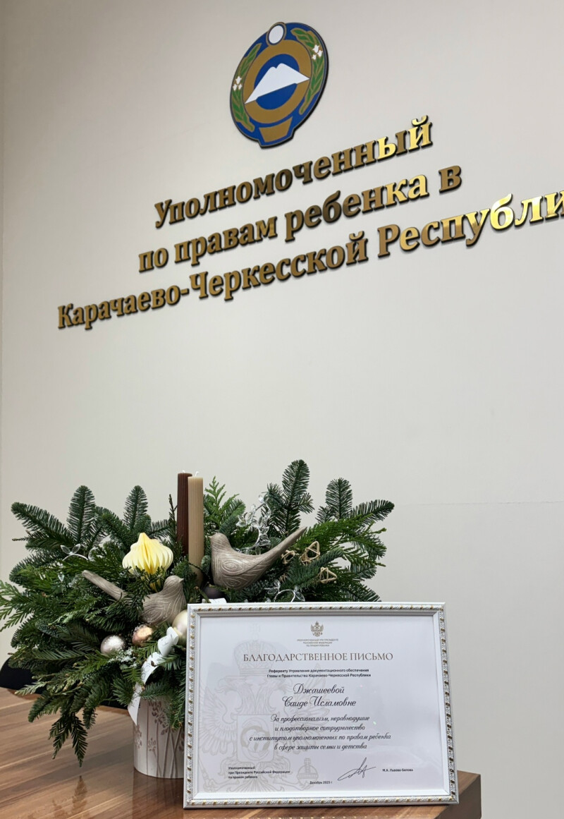 Сегодня Уполномоченный по правам ребенка в Карачаево-Черкесской Республике Алакаева Мария Юрьевна по поручению Уполномоченного при Президенте Российской Федерации по правам ребенка Марии Алексеевны Львовой-Беловой вручила благодарственное письмо референту управления документационного обеспечения администрации Главы и Правительства Карачаево-Черкесской Республики Саиде Исламовне Джашеевой.