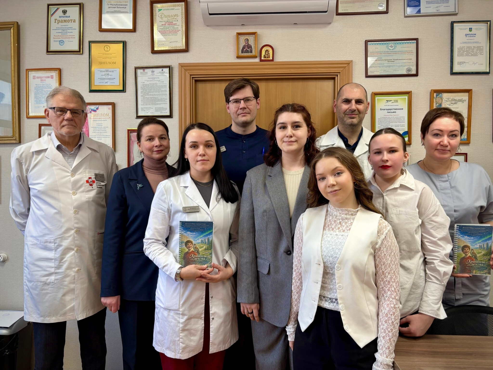 В теплой и дружеской обстановке девочки вручили именные экземпляры книг докторам республиканской детской клинической больницы, которые делились своими историями во время интервью: Наталье Николаевне Кораблевой, Наталье Валерьевне Митрониной, Даниилу Вячеславовичу Гоппе, Михаилу Васильевичу Прошутинскому, Игорю Генриховичу Кустышеву.