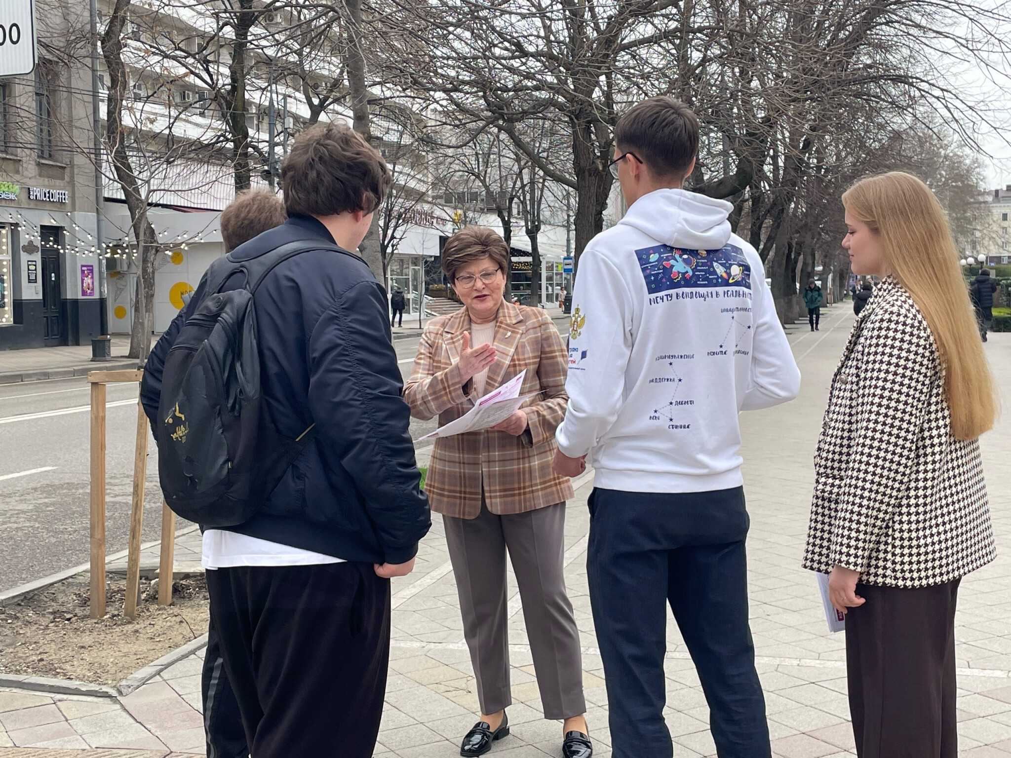 В формате живого общения взрослые и юные волонтеры вышли на центральную улицу краевой столицы, чтобы напрямую пообщаться с подростками. Татьяна Федоровна рассказала молодым людям о значении театрального искусства в развитии личности, важности выбора увлечений, которые помогают раскрыть талант и найти новых друзей. Представители Союза театральных деятелей и члены Детского совета поделились информацией о театральной жизни города и бесплатных мероприятиях, доступных для посещения.