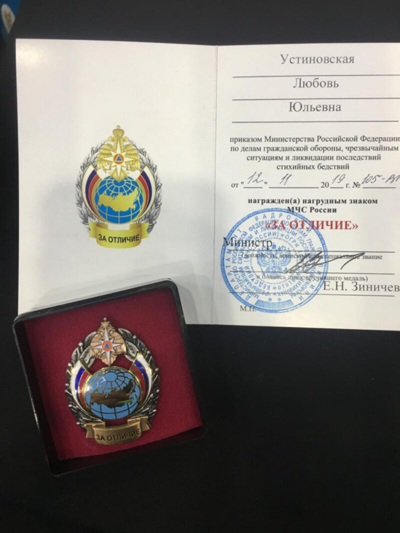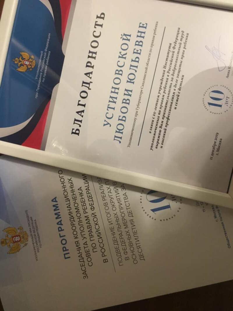 В ходе торжественного награждения работа Уполномоченного при Губернаторе Сахалинской области по правам ребенка Л. Устиновской в деле защиты прав детей была отмечена Министром МЧС России нагрудным знаком "За отличие" и Благодарностью Уполномоченного при Президенте Российской Федерации по правам ребенка.