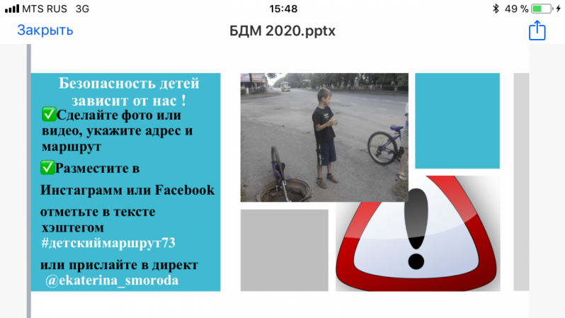 Если Вы на пути следования ребенка в школу или иные объекты заметили угрозу, опасность для ребёнка – не пройдите мимо, остановитесь на секунду, сделайте фото или видео, укажите адрес и маршрут. Отметьте в тексте публикации в Инстаграмм или Facebook хэштегом #детскиймаршрут73 или прислайте в директ Уполномоченному @ekaterina_smoroda.