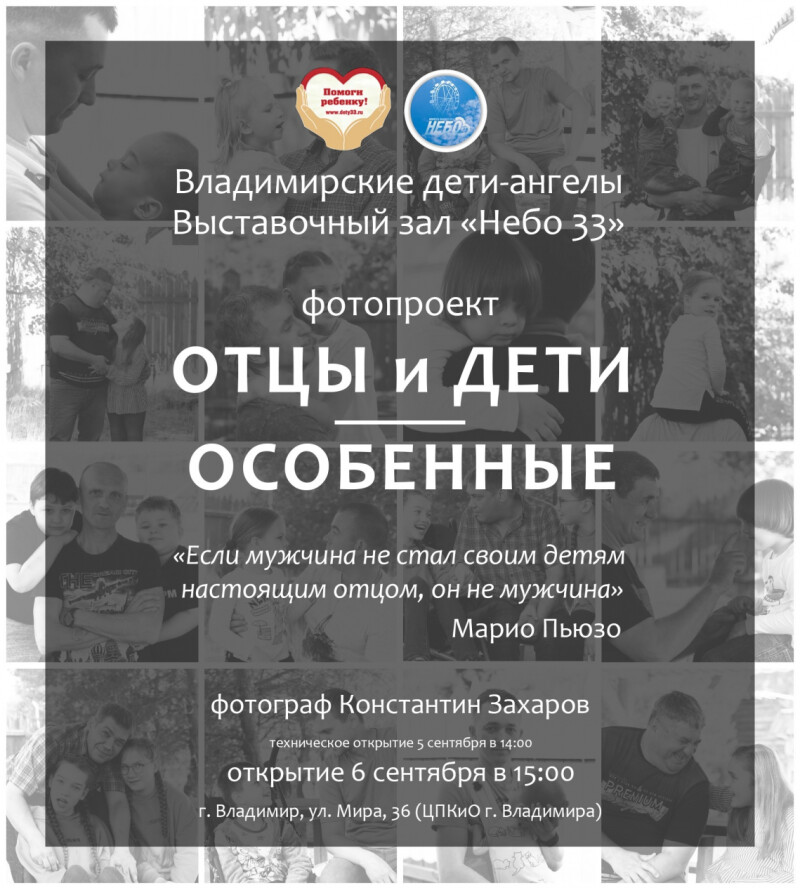 6 сентября во Владимире в паке 850-летия г. Владимира открылась выставка «Отцы и дети. Особенные». «Отцы и дети. Особенные» — социальный фотопроект о папах из Владимира, воспитывающих детей с ограниченными возможностями здоровья.