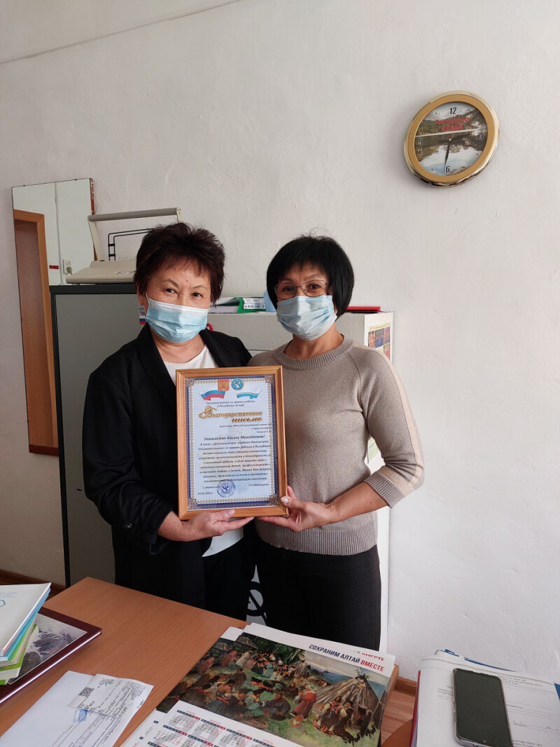 Уполномоченный по правам ребенка в Республике Алтай Надежда Манзырова поздравила преподавателей детской музыкальной школы №2 с новым учебным годом пожелала успешной работы и воспитать как можно больше талантливых детей, поблагодарила коллектив музыкальной школы за выезды в составе рабочей группы в районы, за помощь в работе по профилактике депрессивного поведения детей, за проведенные мастер-классы по хореографии, игры на музыкальных инструментах. Детский омбудсмен вручила благодарственные письма по случаю празднования 10-летия службы уполномоченного по правам ребенка в Республике Алтай директору музыкальной школы №2 г.Горно-Алтайска Чининой Айсулу Михайловне, а также Тадыровой Александре Владимировне – преподавателю отделения хореографии, руководителю ансамбля «Тан Чолмон» («Утренняя Звезда»). Надежда Манзырова выразила признательность творческому коллективу в воспитании талантливого подрастающего поколения и выразила надежду на дальнейшее сотрудничество в деле защиты прав детей.
