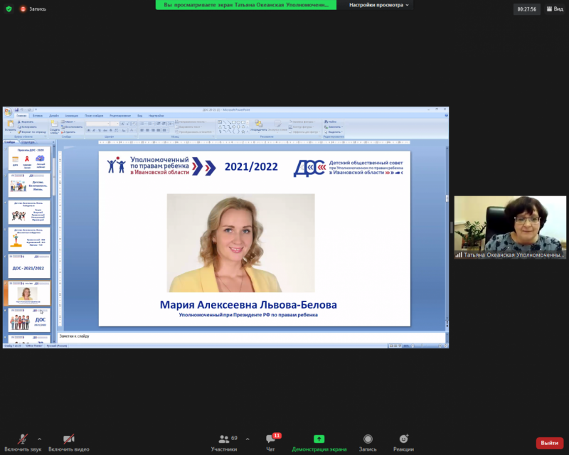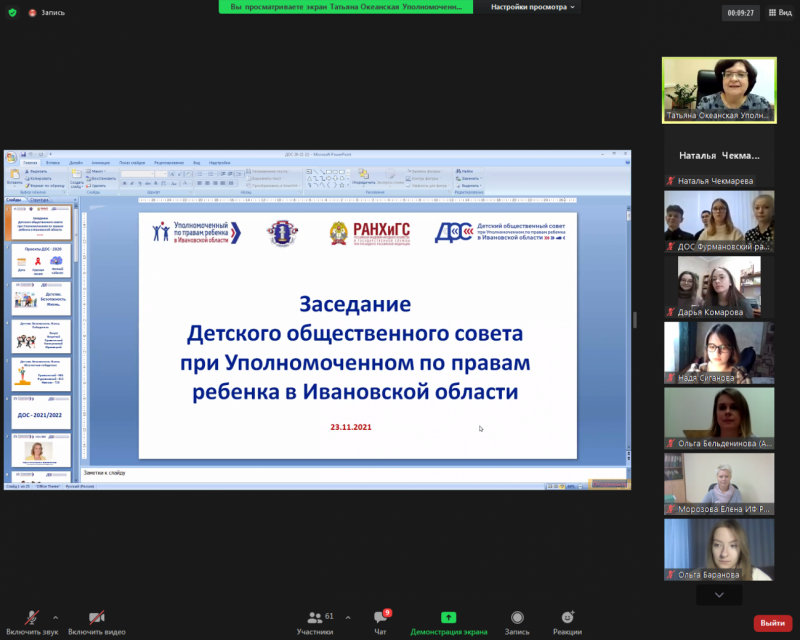 В режиме видеоконференции 23 ноября 2021 года состоялось расширенное заседание Детского общественного совета при Уполномоченном по правам ребенка в Ивановской области.