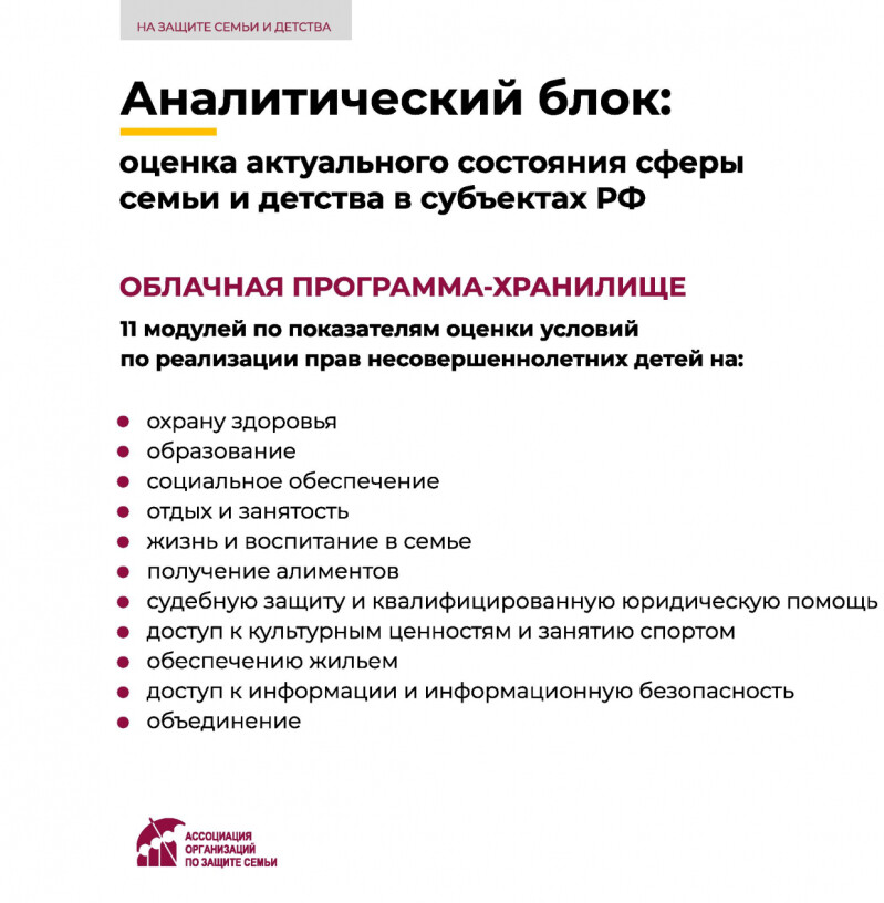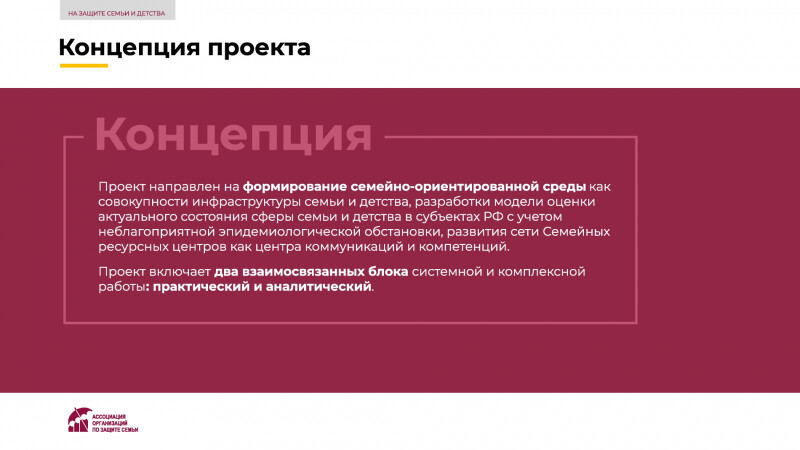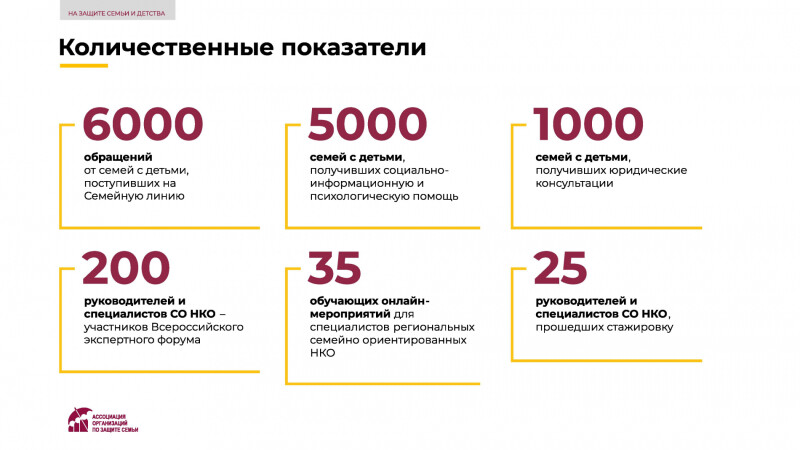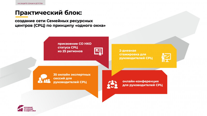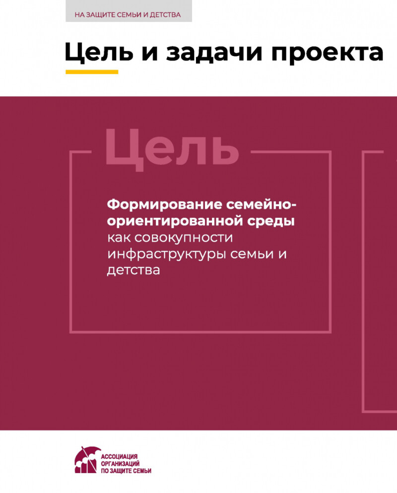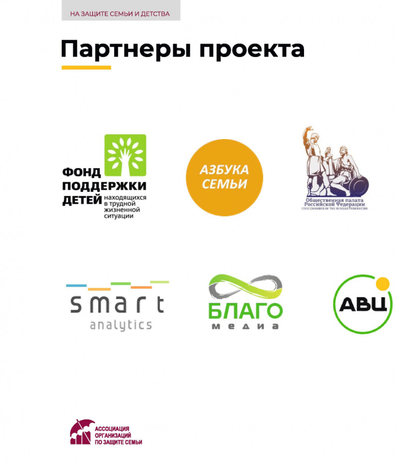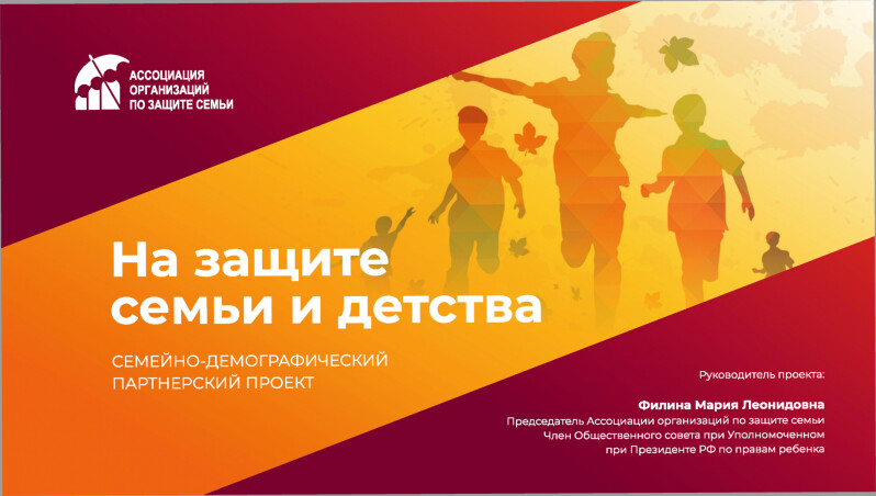 Ассоциации организаций по защите семьи с 1 июля 2021 года реализовывает проект «На защите семьи и детства», направленный на совершенствование инфраструктуры поддержки семьи, материнства, отцовства и детства. Проект поддержан Фондом президентских грантов.