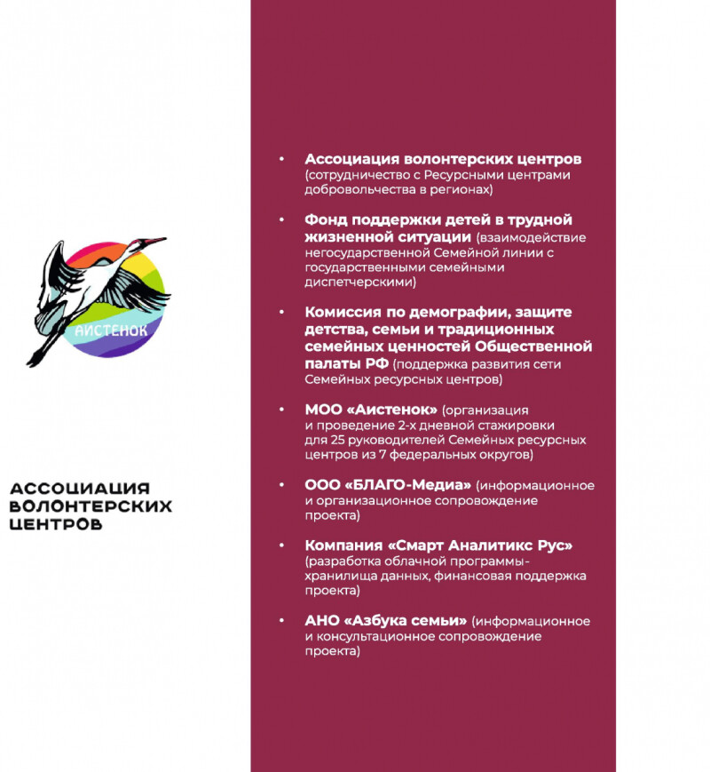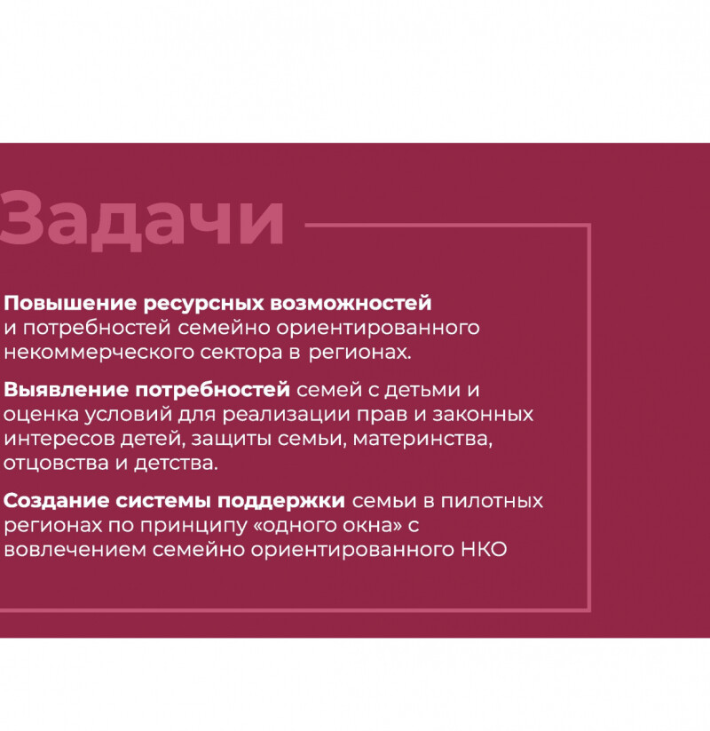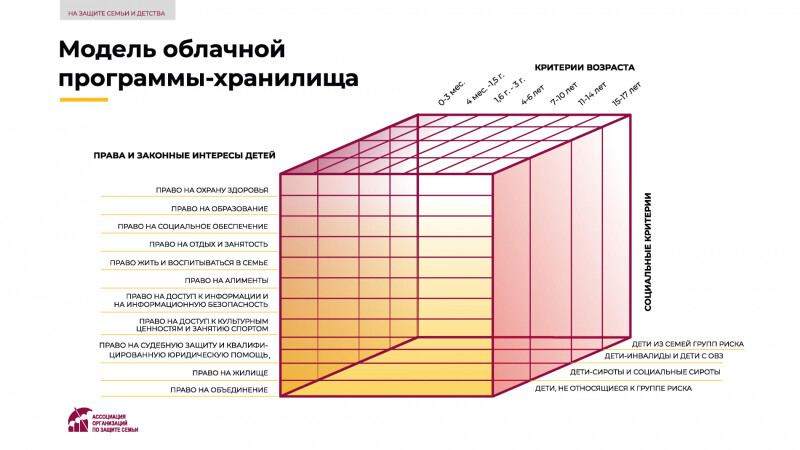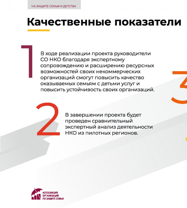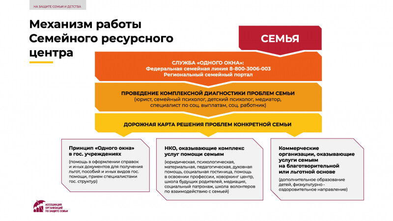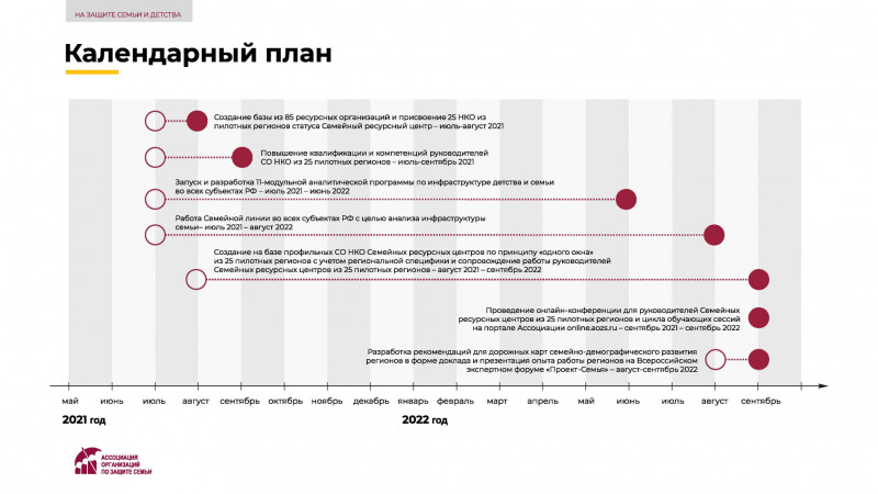 Ассоциации организаций по защите семьи с 1 июля 2021 года реализовывает проект «На защите семьи и детства», направленный на совершенствование инфраструктуры поддержки семьи, материнства, отцовства и детства. Проект поддержан Фондом президентских грантов.