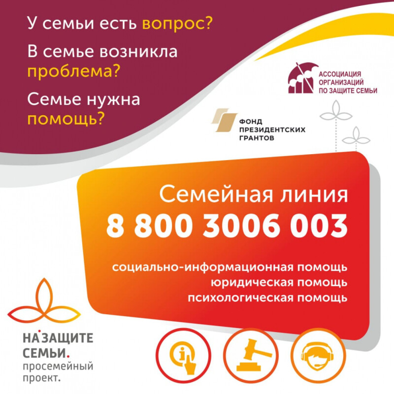Если у вас есть сомнения по поводу социальных выплат и любые другие вопросы в сфере социальной защиты, здравоохранения, образования, то на Семейной Линии смогут ответить на эти вопросы.