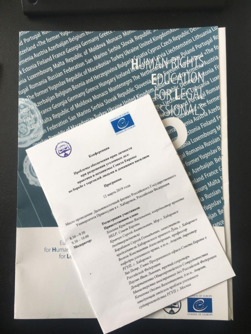 Уполномоченный при Губернаторе Сахалинской области по правам ребенка Л.Ю.Устиновская приняла участие в Международной научно-практической конференции, проводимой Советом Европы при поддержке ДВФ ФГБОУВО «Российский государственный университет правосудия» по теме: «Проблемы обеспечения прав личности при разрешении уголовных дел: практика и механизмы Совета Европы по борьбе с торговлей людьми и домашним насилием».