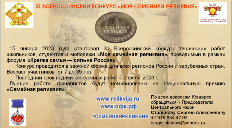 15 января 2023 года стартовал XI Всероссийский конкурс творческих работ школьников, студентов и молодежи «Моя семейная реликвия», проводимый в рамках форума «Крепка семья — сильна Россия».