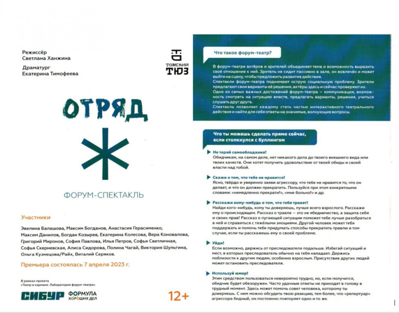 Форум-спектакль «Отряд Ж» с участием подростков проходит в Томском областном Театре юного зрителя (ТЮЗ) в рамках проекта «Театр в кармане». Премьера форум-спектакля состоялась 7 апреля 2023 года. Новый проект «Театр в кармане. Лаборатория форум-театра» затронул непростую тему травли в школе.