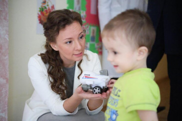 Анна Кузнецова помогает воспитаннику дома ребенка пройти медицинское обследование